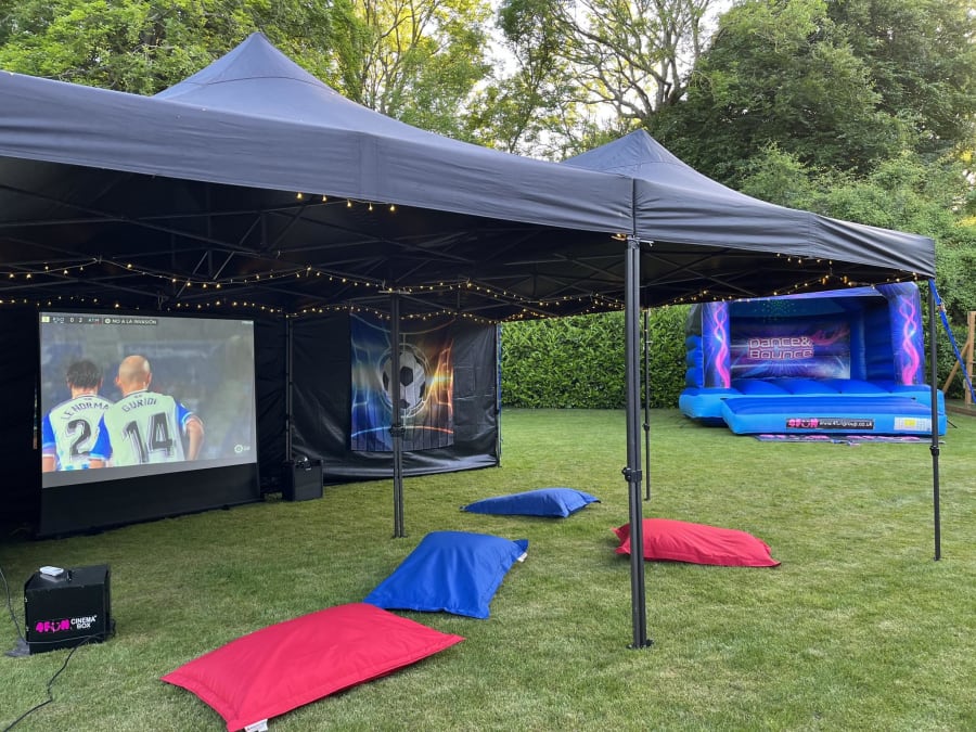 Sports Tent EXTRA LARGE (6m x 6m) with large screen, projector and speaker for hire in Buckinghamshire, Berkshire, Middlesex and Oxfordshire.